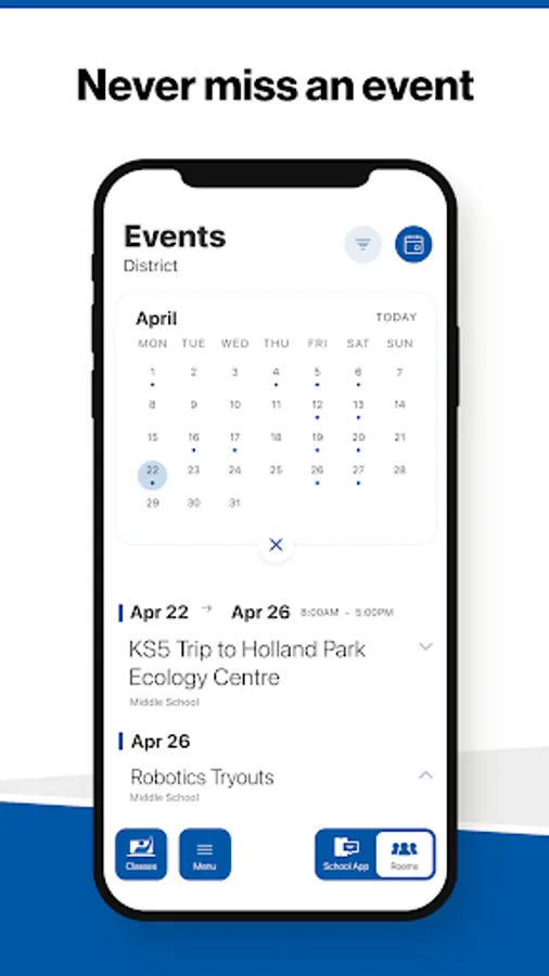 The event section shows a list of events throughout the district. Users can add an event to their calendar to share the event with friends and family with one tap.