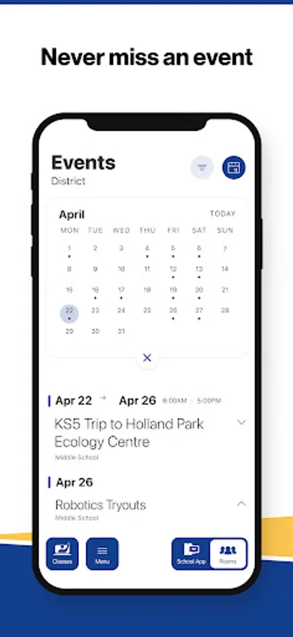 The event section shows a list of events throughout the district. Users can add an event to their calendar to share the event with friends and family with one tap.