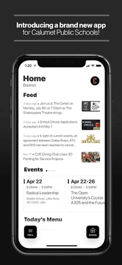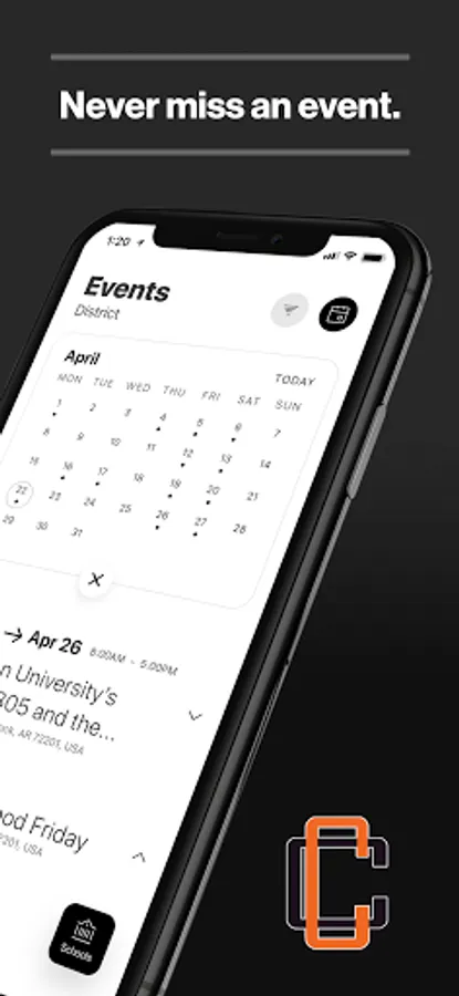 The event section shows a list of events throughout the district. Users can add an event to your calendar to share the event with friends and family with one tap.