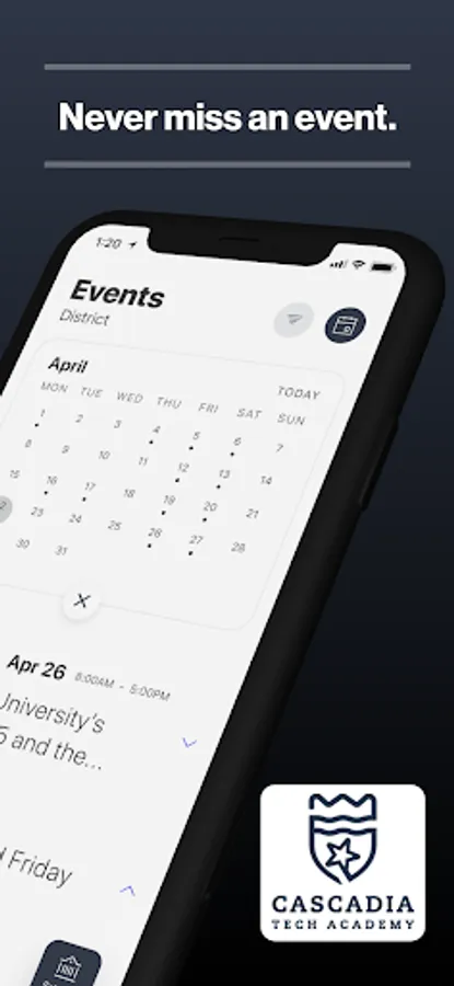 The event section shows a list of events throughout the district. Users can add an event to their calendar to share the event with friends and family with one tap.