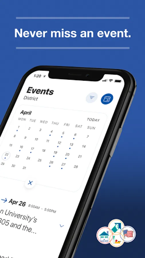 The event section shows a list of events throughout the district. Users can add an event to their calendar to share the event with friends and family with one tap.