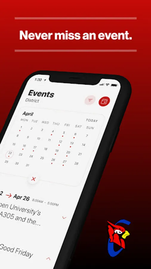 The event section shows a list of events throughout the district. Users can add an event to their calendar to share the event with friends and family with one tap.