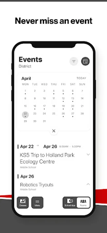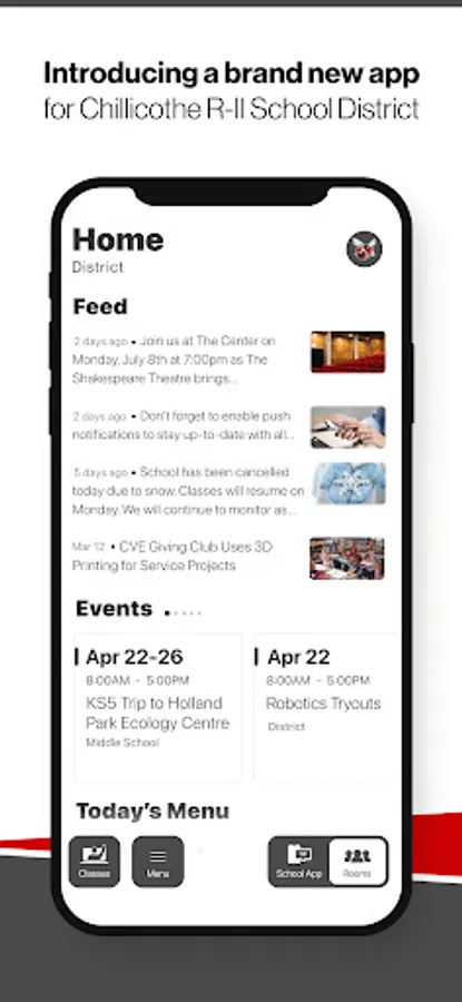 The event section shows a list of events throughout the district. Users can add an event to their calendar to share the event with friends and family with one tap.