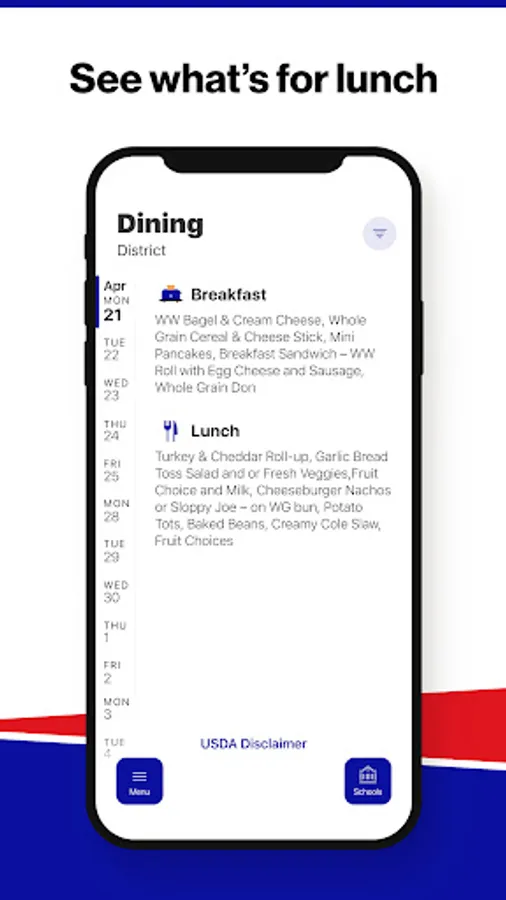 Within the dining section, you'll find an easy to navigate, weekly menu, sorted by day and meal type.