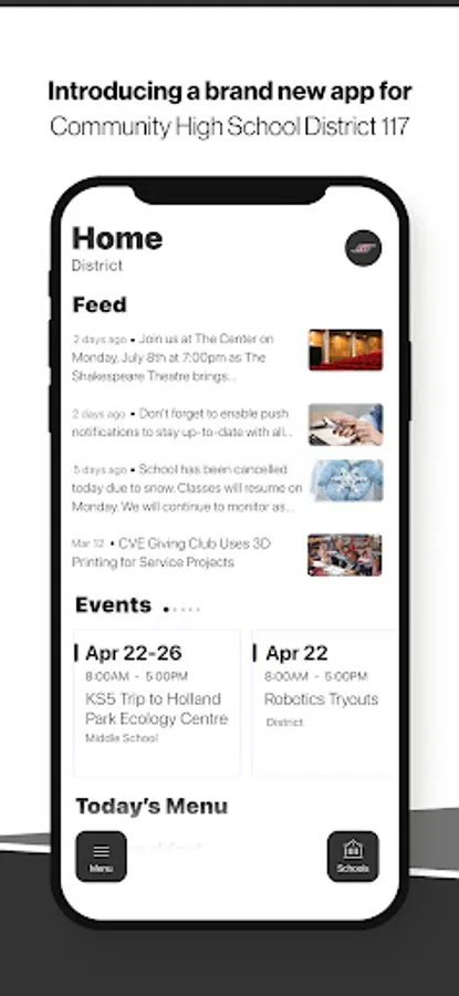The official app for CHSD 117, IL allows users direct access to the most recent news, announcements and event calendars. Customize the app to display information relevant to a specific campus and to receive important notifications from the district. Users may also access the directory of district faculty and staff, view dining menus, find the location of district events, contact campuses and departments, follow athletic scores and updates, and much more.