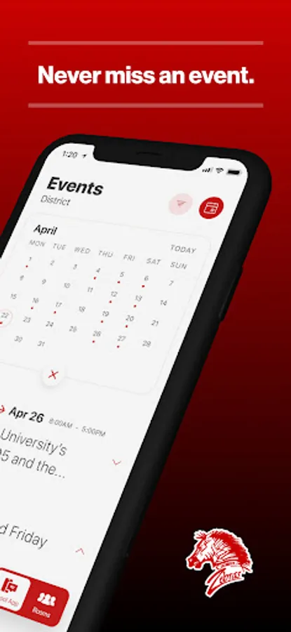 The event section shows a list of events throughout the district. Users can add an event to their calendar to share the event with friends and family with one tap.