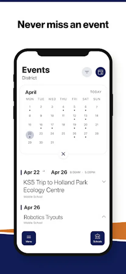 The event section shows a list of events throughout the district. Users can add an event to their calendar to share the event with friends and family with one tap.