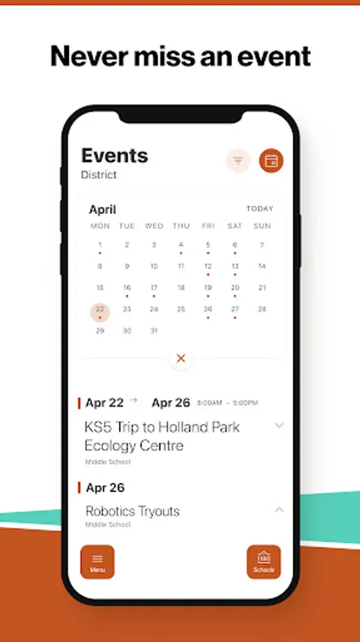 The event section shows a list of events throughout the district. Users can add an event to their calendar to share the event with friends and family with one tap.