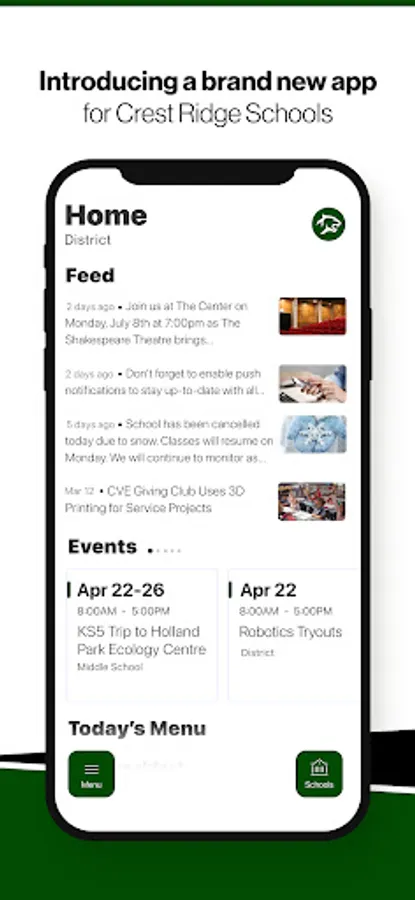 The official app for the Crest Ridge allows users direct access to the most recent news, announcements and event calendars. Customize the app to display information relevant to a specific campus and to receive important notifications from the district. Users may also access the directory of district faculty and staff, view dining menus, find the location of district events, contact campuses and departments, follow athletic scores and updates, and much more.