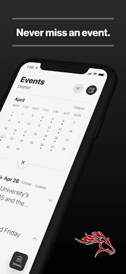 The event section shows a list of events throughout the district. Users can add an event to your calendar to share the event with friends and family with one tap.