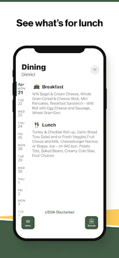 Within the dining section, you'll find an easy to navigate, weekly menu, sorted by day and meal type.