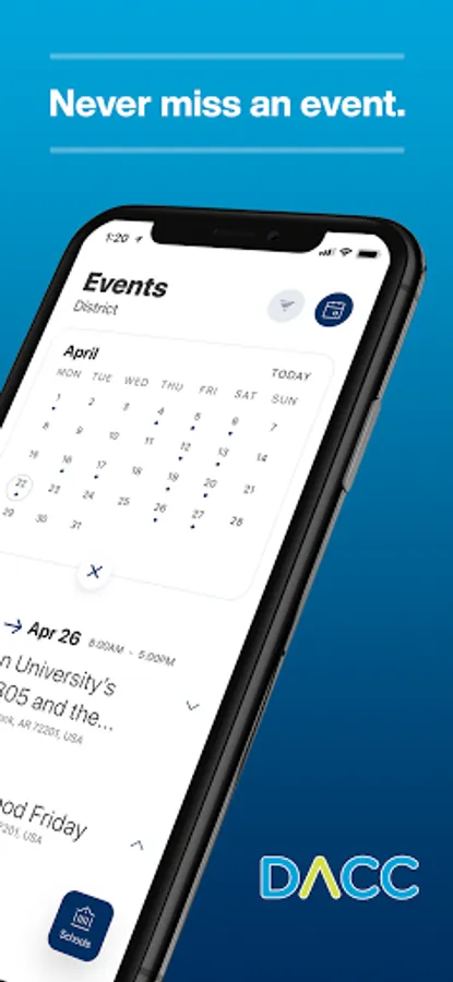 The event section shows a list of events throughout the district. Users can add an event to your calendar to share the event with friends and family with one tap.