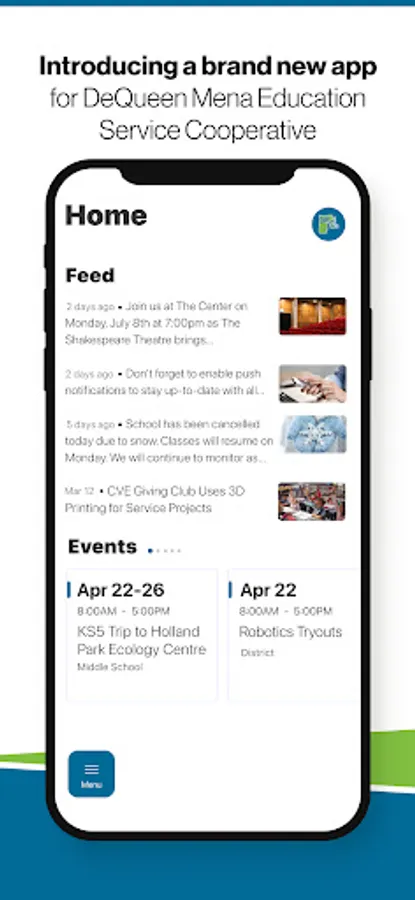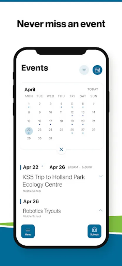The event section shows a list of events throughout the school. Users can add an event to their calendar to share the event with friends and family with one tap.