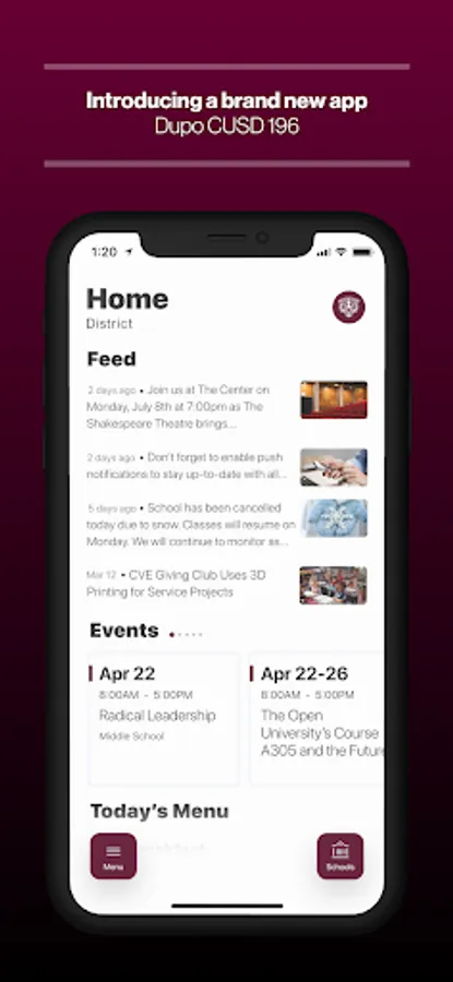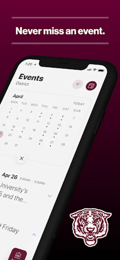The event section shows a list of events throughout the district. Users can add an event to their calendar to share the event with friends and family with one tap.