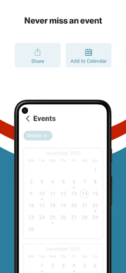 The event section shows a list of events throughout the district. Users can add an event to their calendar and share the event with friends and family with one tap.