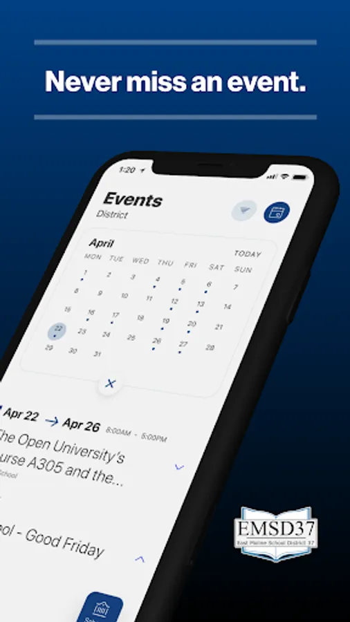 The event section shows a list of events throughout the district. Users can add an event to their calendar to share the event with friends and family with one tap.