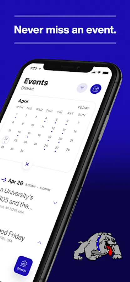 The event section shows a list of events throughout the district. Users can add an event to your calendar to share the event with friends and family with one tap.