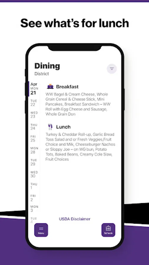 Within the dining section, you'll find an easy to navigate, weekly menu, sorted by day and meal type.