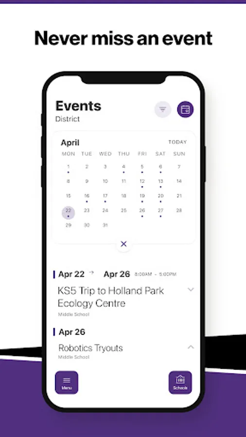 The event section shows a list of events throughout the district. Users can add an event to their calendar to share the event with friends and family with one tap.