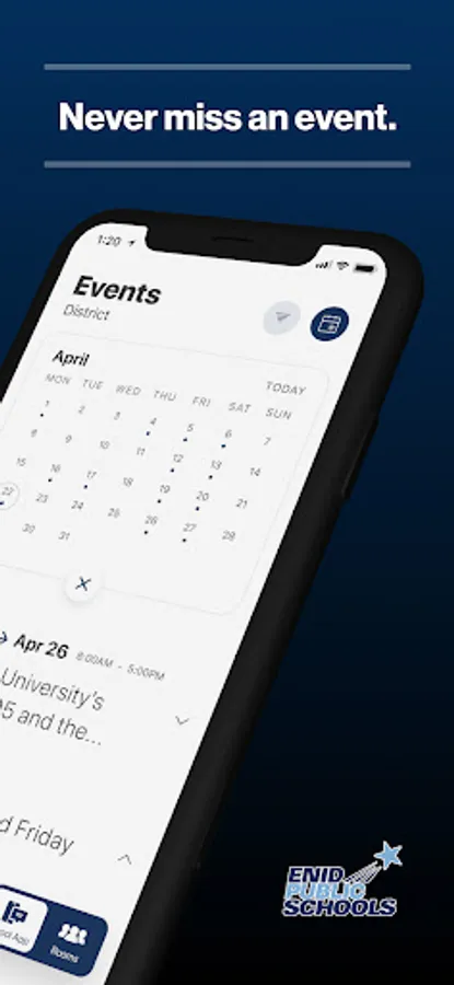 The event section shows a list of events throughout the district. Users can add an event to their calendar to share the event with friends and family with one tap.