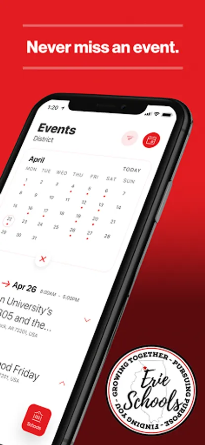The event section shows a list of events throughout the district. Users can add an event to your calendar to share the event with friends and family with one tap.