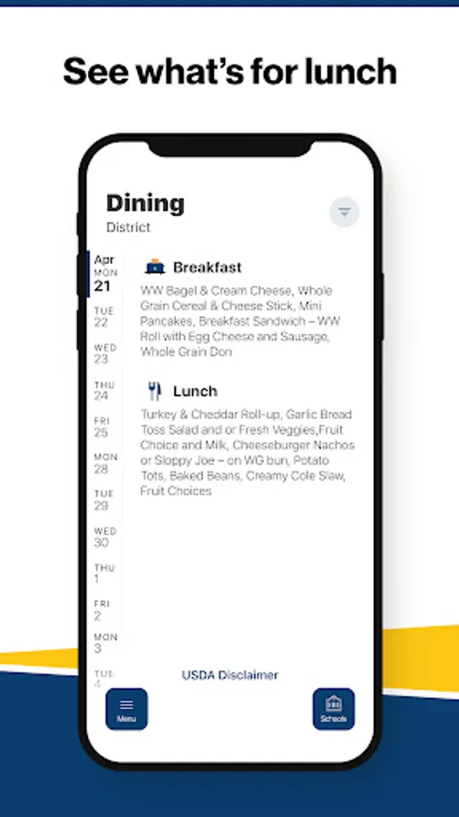 Within the dining section, you'll find an easy to navigate, weekly menu, sorted by day and meal type.