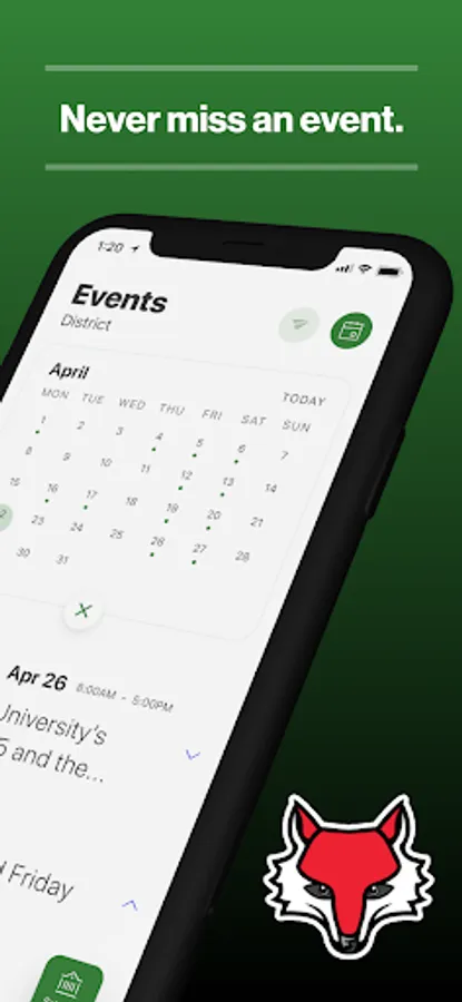 The event section shows a list of events throughout the district. Users can add an event to their calendar to share the event with friends and family with one tap.
