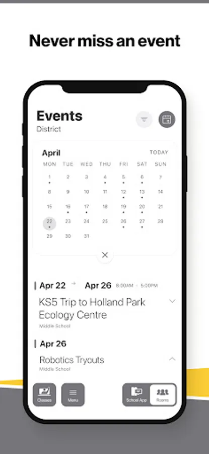 The event section shows a list of events throughout the district. Users can add an event to their calendar to share the event with friends and family with one tap.