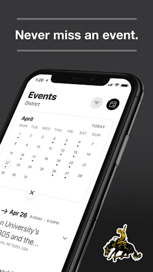 The event section shows a list of events throughout the district. Users can add an event to your calendar to share the event with friends and family with one tap.