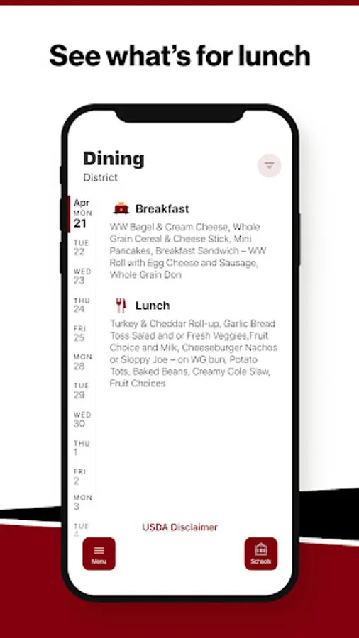 Within the dining section, you'll find an easy to navigate, weekly menu, sorted by day and meal type.