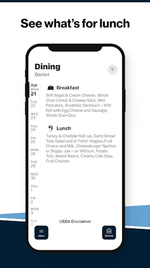 Within the dining section, you'll find an easy to navigate, weekly menu, sorted by day and meal type.