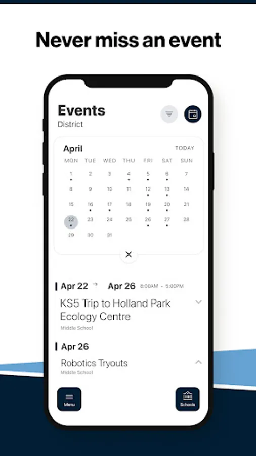The event section shows a list of events throughout the district. Users can add an event to their calendar to share the event with friends and family with one tap.