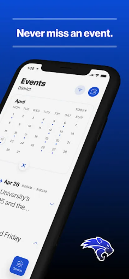 The event section shows a list of events throughout the district. Users can add an event to your calendar to share the event with friends and family with one tap.