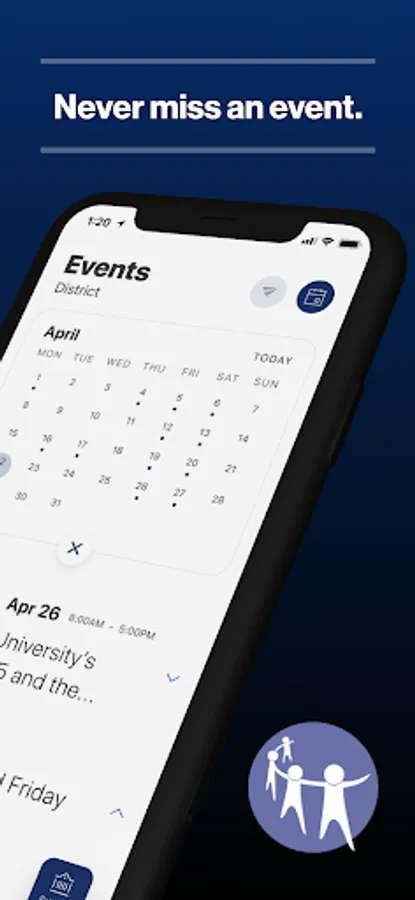 The event section shows a list of events throughout the district. Users can add an event to their calendar to share the event with friends and family with one tap.