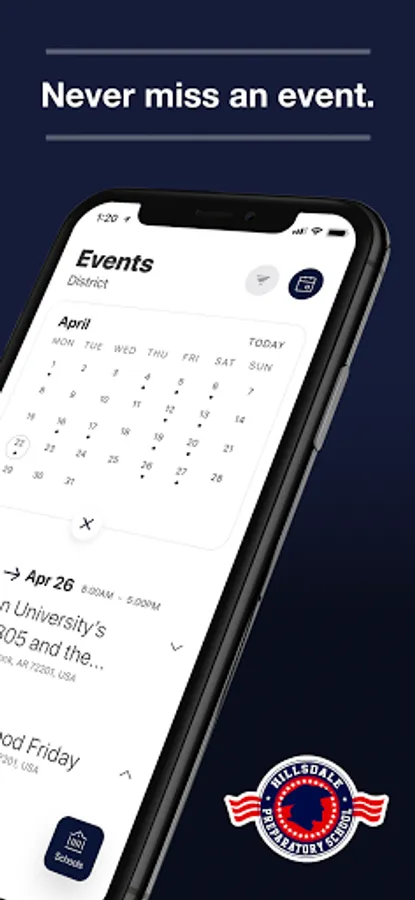 The event section shows a list of events throughout the district. Users can add an event to their calendar to share the event with friends and family with one tap.