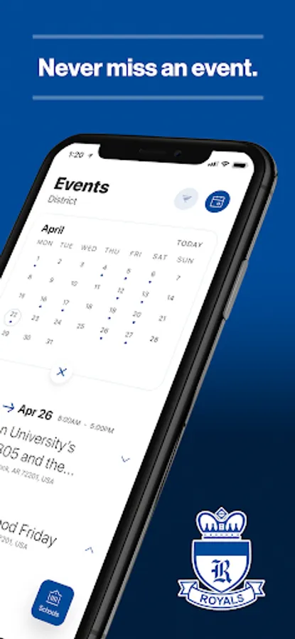 The event section shows a list of events throughout the district. Users can add an event to their calendar to share the event with friends and family with one tap.