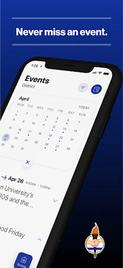The event section shows a list of events throughout the district. Users can add an event to your calendar to share the event with friends and family with one tap.