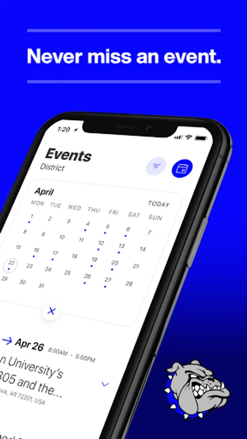 The event section shows a list of events throughout the district. Users can add an event to your calendar to share the event with friends and family with one tap.