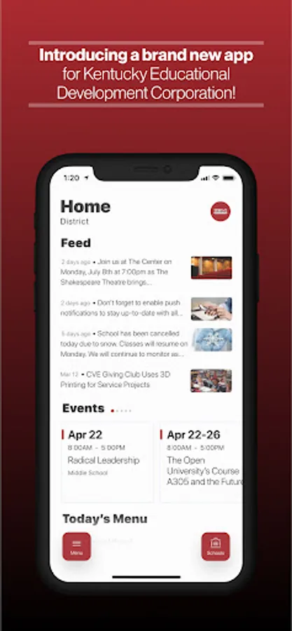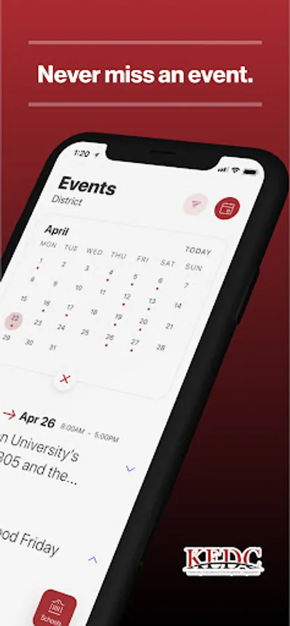 The event section shows a list of events throughout the district. Users can add an event to their calendar to share the event with friends and family with one tap.