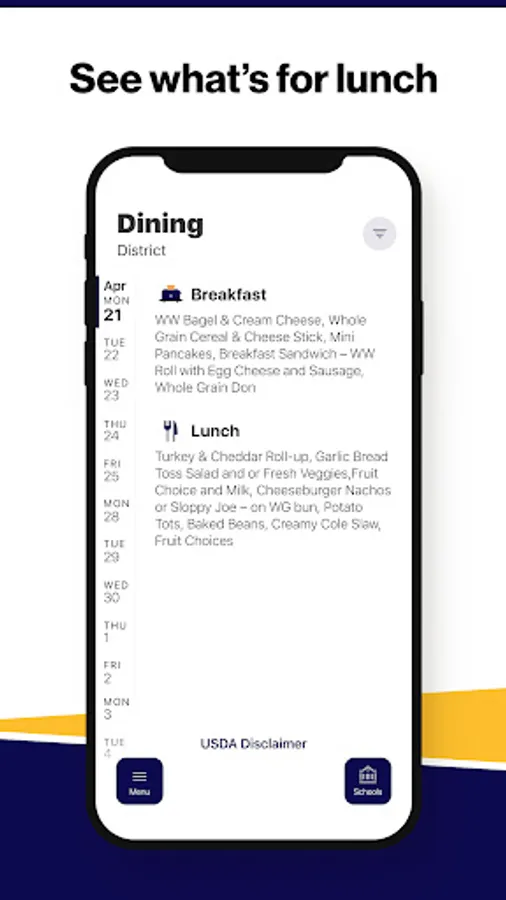 Within the dining section, you'll find an easy to navigate, weekly menu, sorted by day and meal type.