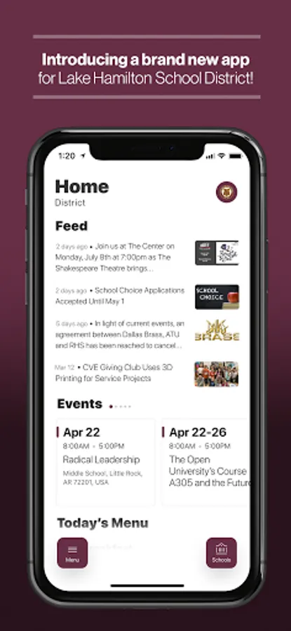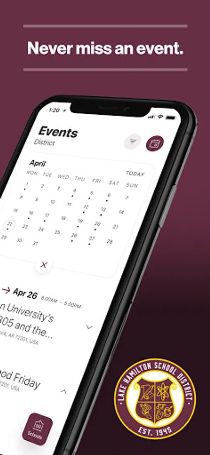 The event section shows a list of events throughout the district. Users can add an event to your calendar to share the event with friends and family with one tap.