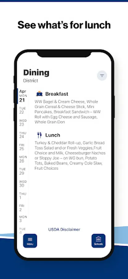 Within the dining section, you'll find an easy to navigate, weekly menu, sorted by day and meal type.