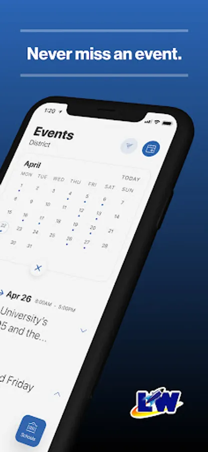 The event section shows a list of events throughout the district. Users can add an event to your calendar to share the event with friends and family with one tap.