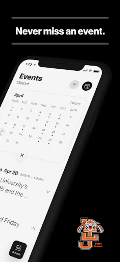The event section shows a list of events throughout the district. Users can add an event to your calendar to share the event with friends and family with one tap.