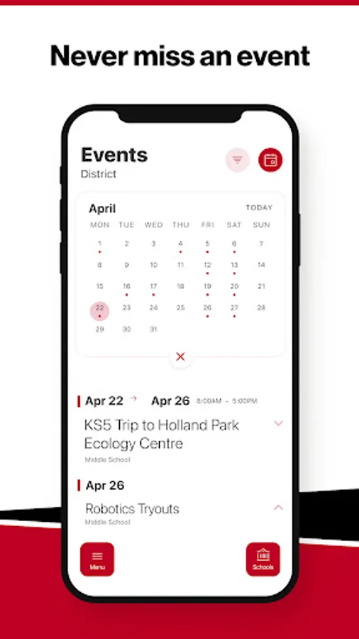 The event section shows a list of events throughout the district. Users can add an event to their calendar to share the event with friends and family with one tap.