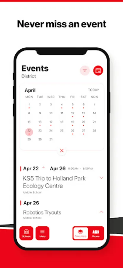 The event section shows a list of events throughout the district. Users can add an event to their calendar to share the event with friends and family with one tap.