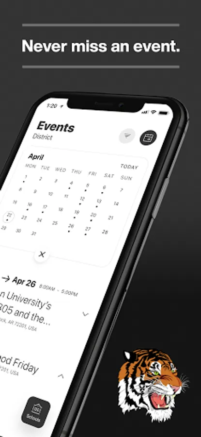 The event section shows a list of events throughout the district. Users can add an event to your calendar to share the event with friends and family with one tap.
