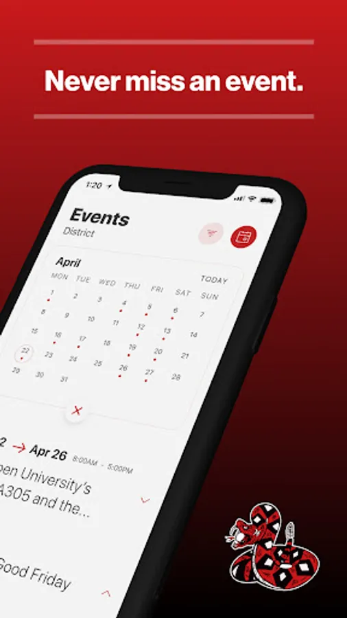 The event section shows a list of events throughout the district. Users can add an event to their calendar to share the event with friends and family with one tap.