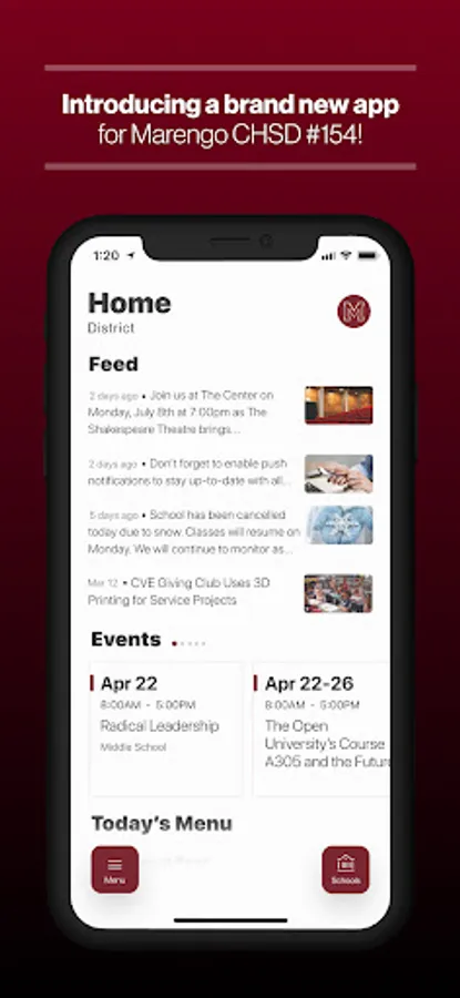 The event section shows a list of events throughout the district. Users can add an event to their calendar to share the event with friends and family with one tap.