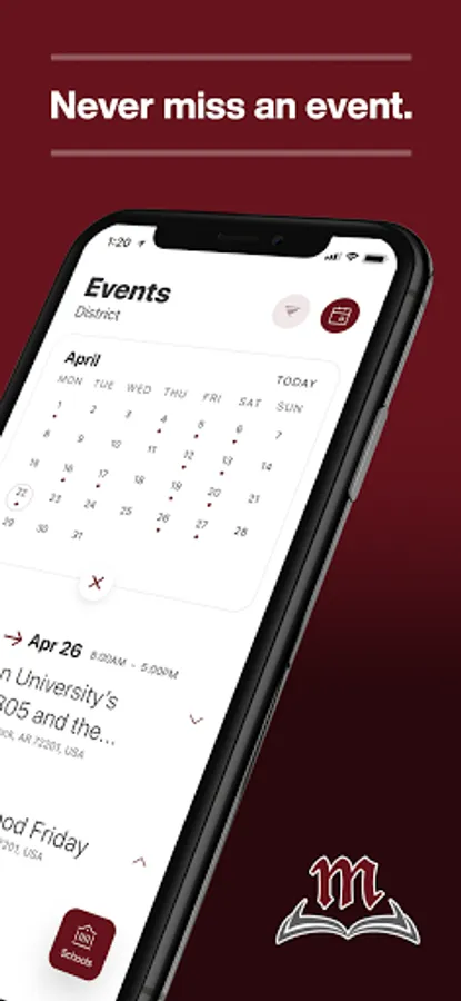 The event section shows a list of events throughout the district. Users can add an event to their calendar to share the event with friends and family with one tap.